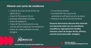 Documents à fournir : passeport, justificatif de ressources, adresse au Maroc, contrat de location, photos, etc.